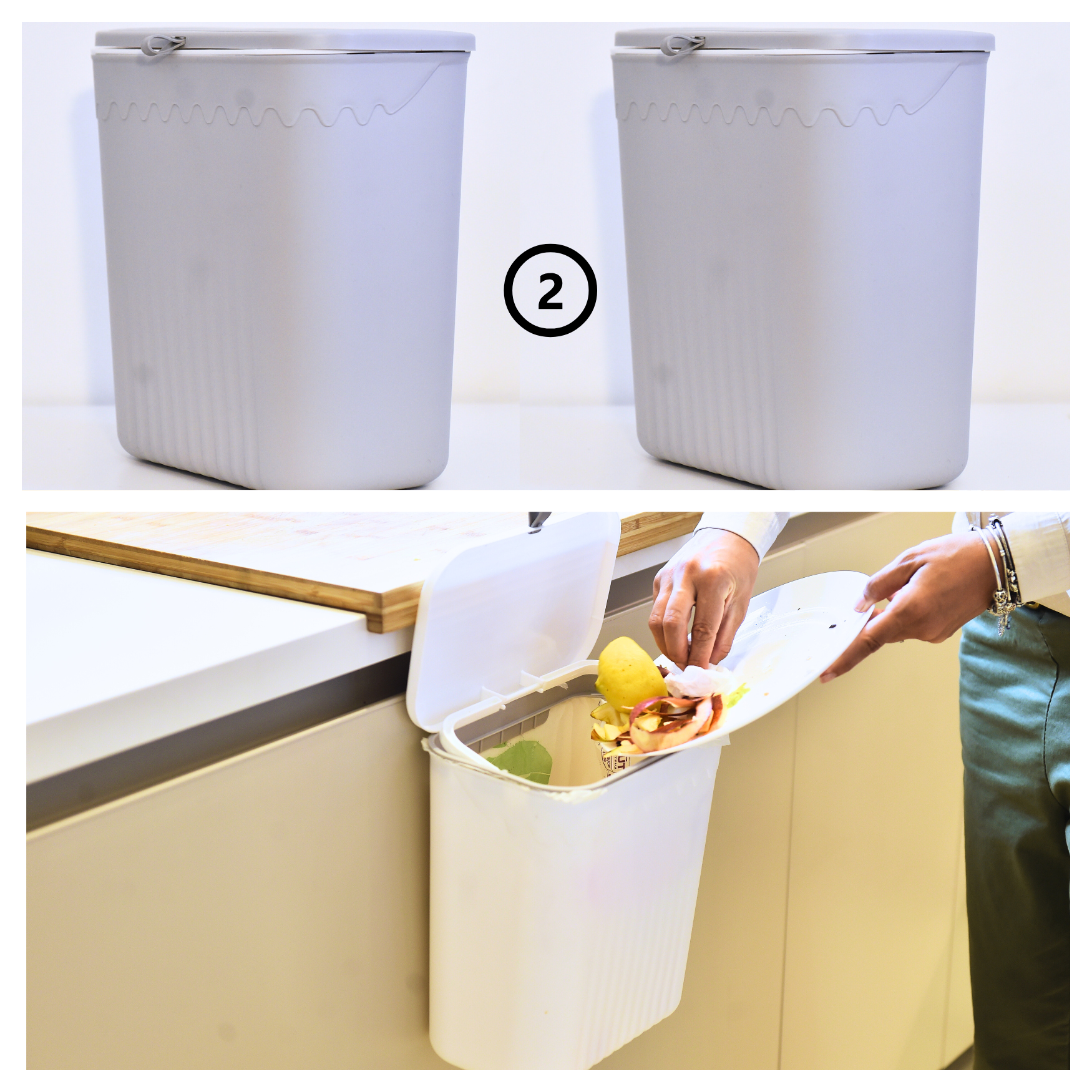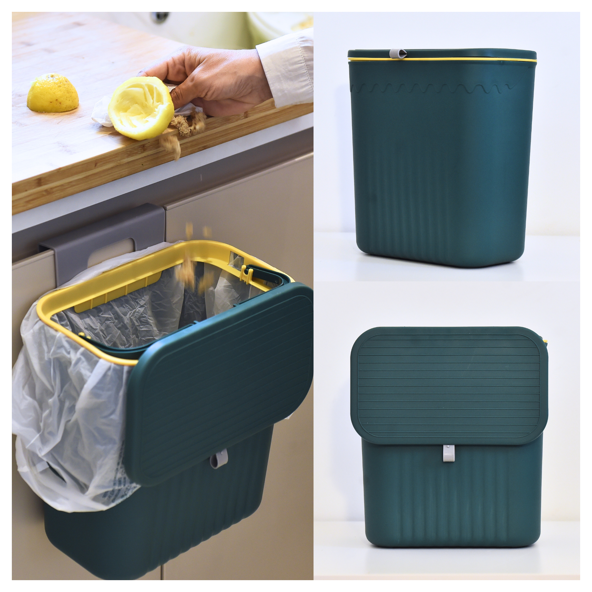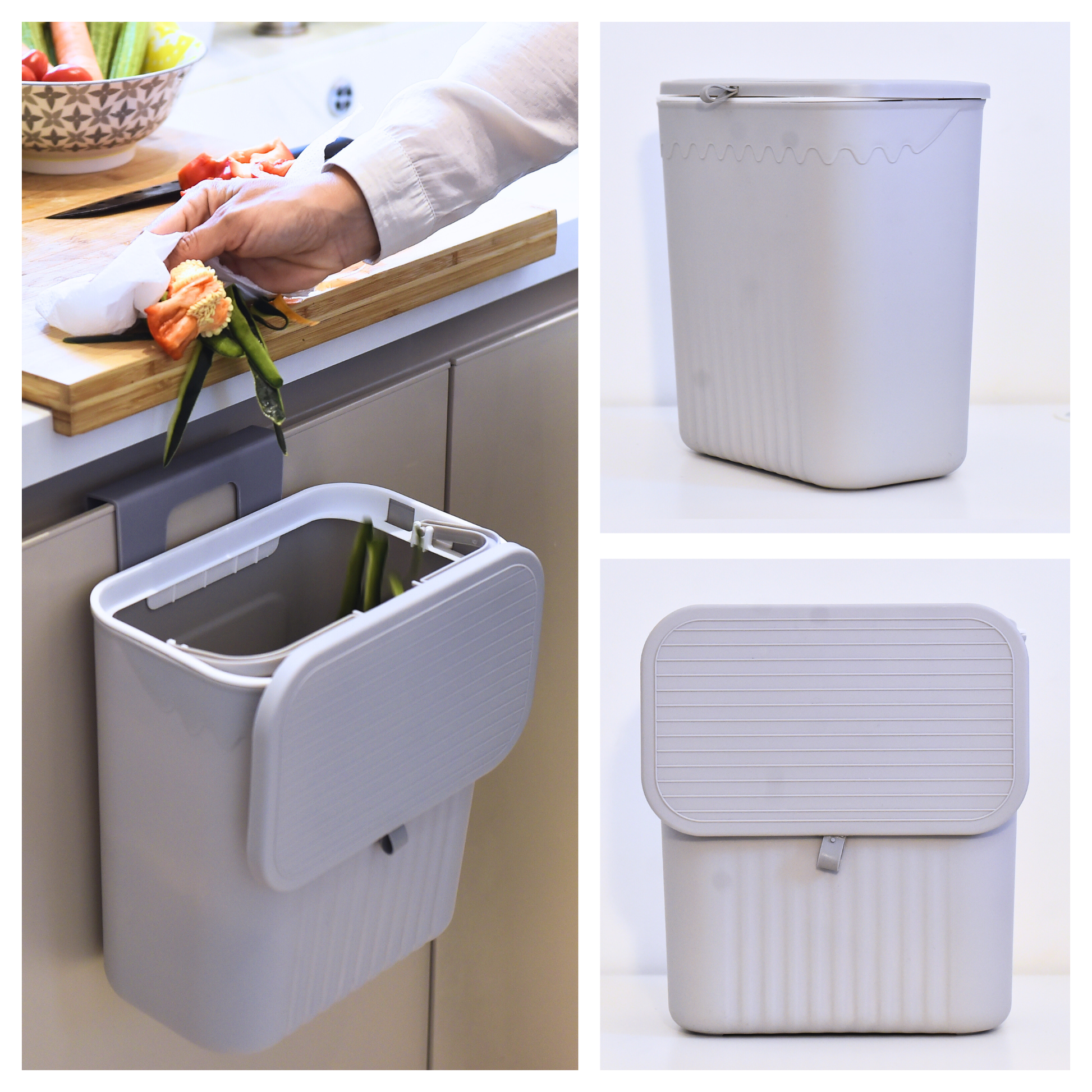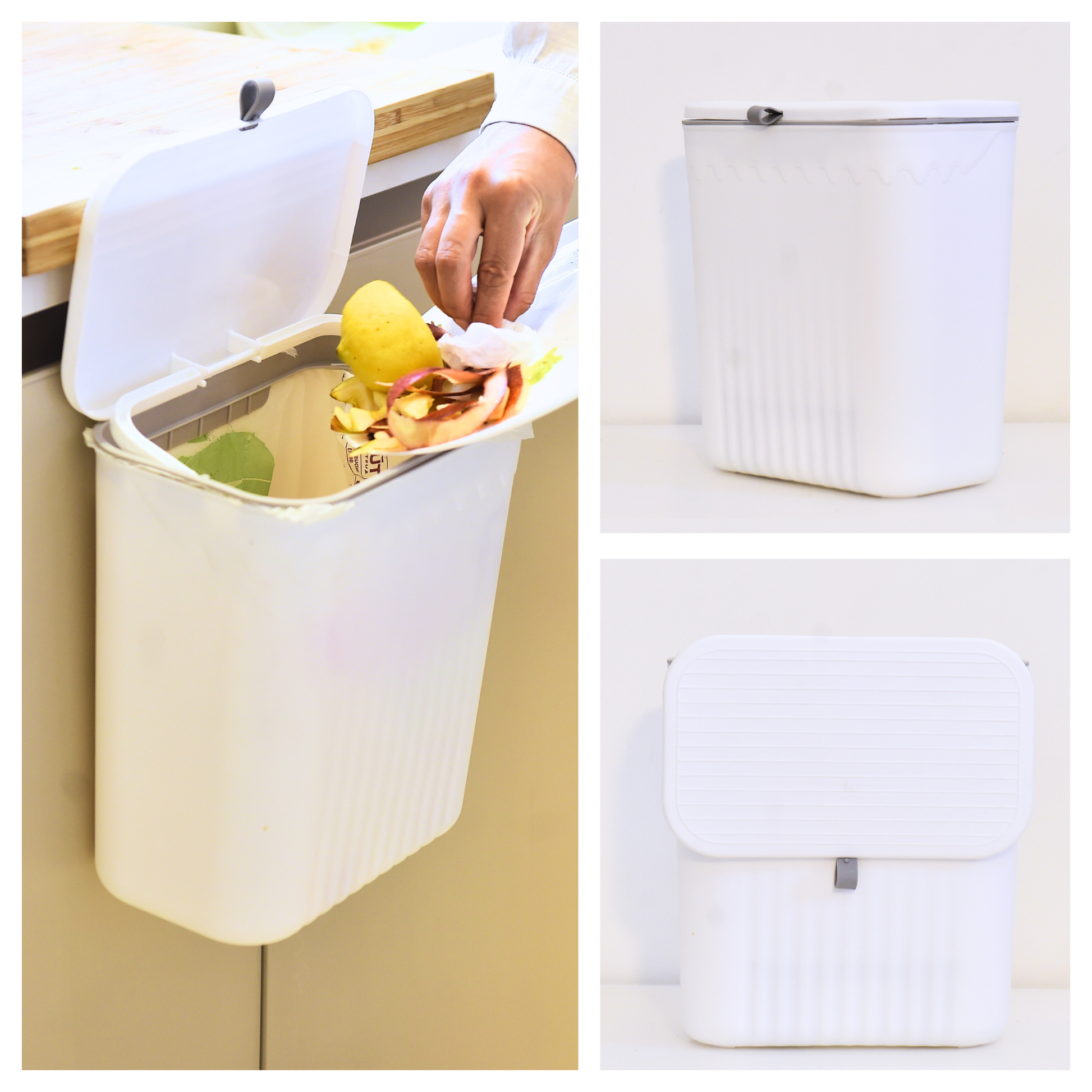 Pattumiera sospesa 12 litri salvaspazio, perfetta per la raccolta differenziata dell'umido, con coperchio scorrevole. 3 varianti di colore: verde, grigia, bianca.